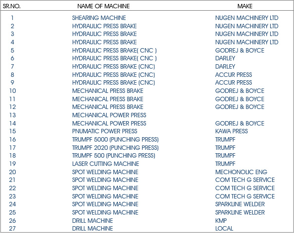 LIST OF MACHINERY